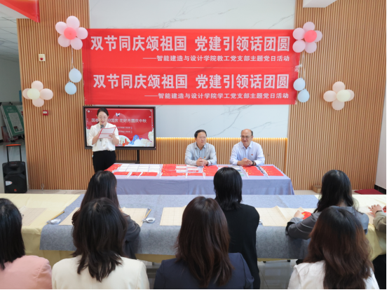 为庆祝中华人民共和国成立76周年与传统中秋佳节,深入学习贯彻习近平新时代中国特色社会主义思想,推动党建工作与传统文化、爱国教育深度融合。2025年9月25日,智能建造与设计学院学工党支部与教工党支部在开封北院F楼大厅联合开展“双节同庆颂祖国,党建引领话团圆”主题党日活动。校党委委员、副校长常新中以普通党员身份参与本次活动,活动由学院党总支副书记刘亚娟主持,学院全体党员教师、部分学生代表参与。