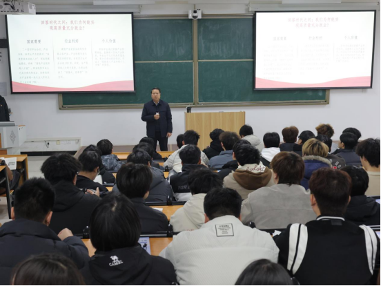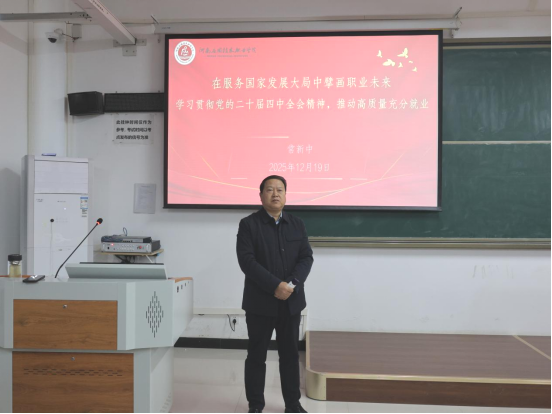 2025年12月19日,校党委委员、副校长常新中在开封北院D201为智能建造与设计学院入党积极分子讲授主题为“在服务国家发展大局中擘画职业未来——学习贯彻党的二十届四中全会精神,推动高质量充分就业”的专题党课。