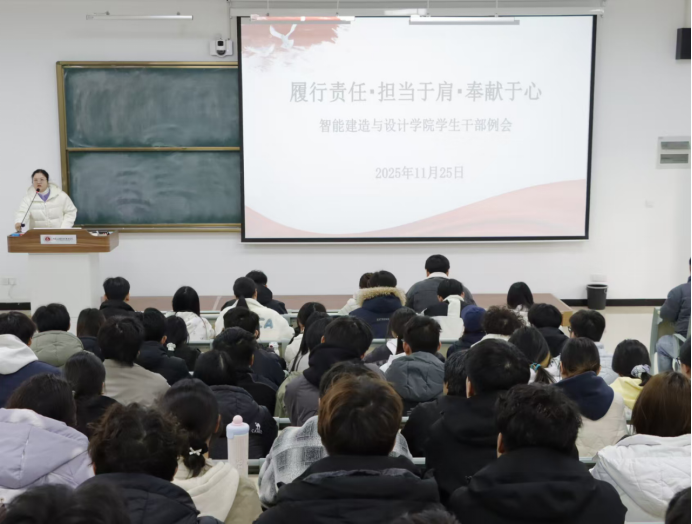 为锚定工作方向、凝聚奋进力量、强化责任担当,智能建造与设计学院于2025年11月25日在A102教室隆重召开“履行职责、担当于肩、奉献于心”主题学生干部例会。学工办主任史真,专职辅导员陈静静、尹宇龙、李希望出席会议,学生会全体干部及各班班长参会,学生会主席王自杰主持会议。