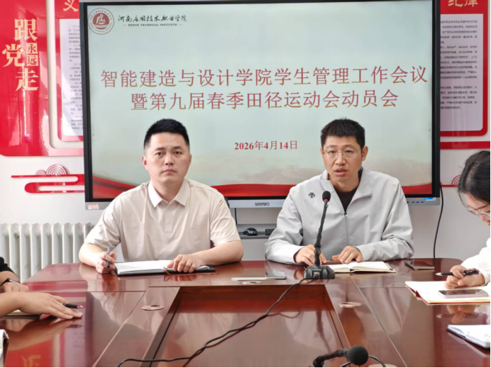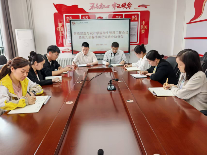 2026年4月14日,智能建造与设计学院召开学生管理会议暨第九届春季田径运动会动员会。学院党总支书记宁晓冬、副书记张蓄金出席会议,全体专兼职辅导员参加会议,会议由张蓄金主持。