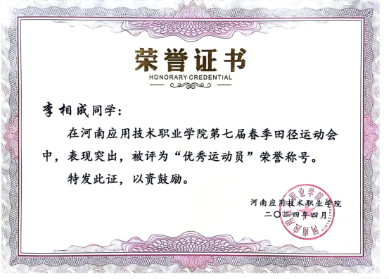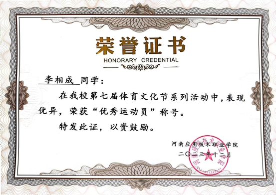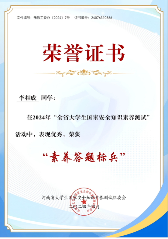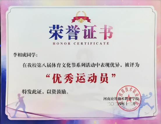 李相成在书山题海中奋勇攀登的同时,还积极投身于世俱杯买球官网网站学生工作,凭借出色表现,他在2024年当选“世俱杯买球官网网站学生会主席”。任职期间,李相成时刻以身作则,严于律己,用实际行动诠释着责任与担当。他将军旅生涯锤炼出的责任意识与高效执行力注入每一项工作,带领学生会成员积极开展一系列丰富多彩且富有意义的活动。他注重团队建设,经常组织大家进行交流学习,提升团队的综合素质和工作能力。他积极组织各类文体活动,如运动会、文艺晚会等。在他的带领下,学生会成员们团结协作,高效完成了一场又一场活动,为校园文化建设添上了浓墨重彩的一笔,赢得师生们一致好评,荣获“优秀学生干部”称号。