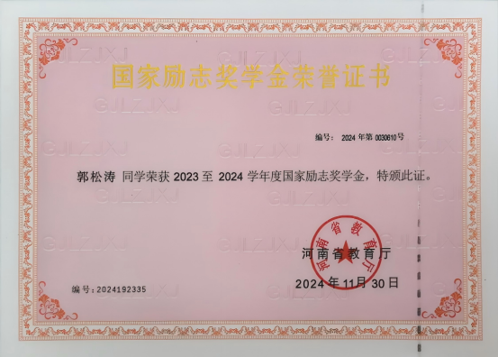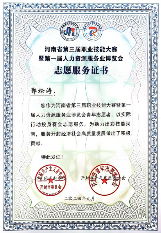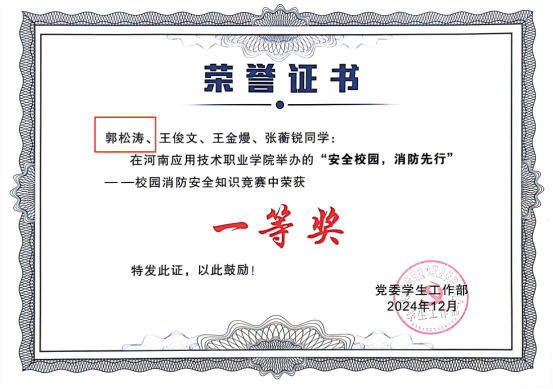郭松涛,男,汉族,2003年10月生,河南洛阳人,中共预备党员。智能建造与设计学院建设工程管理2301班学生,辅导员黄梦娜。在校期间,荣获国家励志奖学金、国家版权局计算机软件著作权登记证书、河南省三好学生、2025年中国国际大学生创新创业大赛省级一等奖、2024年中国国际大学生创新创业大赛省级二等奖以及校级、院级奖项若干。