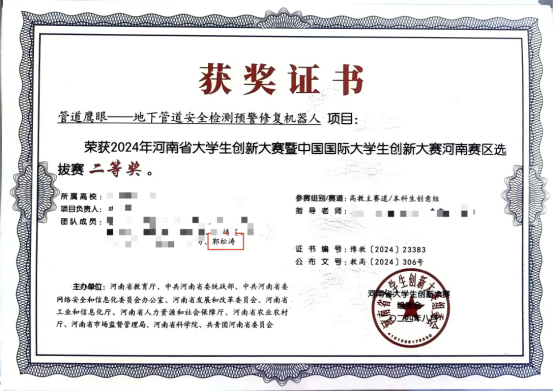 为了让知识真正“活”起来,他主动拓展学习边界。课余时间,他大量查阅专业前沿文献,了解行业世俱杯外围世俱杯买球投注动态;积极参与专业技能实训项目,把课堂上学到的理论努力应用于实践中。2024年,中国国际大学生创新创业大赛的消息传来,他牵头组建团队。从确定“管道鹰眼”项目选题,到深入市场调研用户需求,再到反复打磨方案细节,他和团队成员常常一干就是一整天。最终,项目斩获河南赛区省级二等奖,同时他也积累了经验,在2025年,负责的“刀医生”项目获得河南赛区省级一等奖。此外,他还成功申请并获得国家计算机软件著作权登记证书。凭借着他的努力,文化课成绩与量化成绩也始终稳居班级第一。同时,校园内的竞赛,他也踊跃报名,获得校级、院级奖项,数十余项。