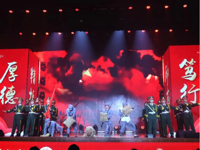 《旗帜》以跨越历史的视觉语言,构建了一场穿越时空的信仰对话。舞台上,从四位八路军战士手握残破却依然挺立的红旗,到当代军人手持崭新完整的国旗,这一“从破碎到完整,从坚守到传承”的视觉象征,在“牺牲”与“接过”的肢体对话中完成代际传递,背景纪录片的真实影像与表演交融,将观众带入壮阔历程。舞蹈巧妙融入建筑语汇,旗帜挥动勾勒蓝图,军姿挺立如工程柱石,通过“筑台—风雨—重建”的舞段诠释锲而不舍,以人体筑起攀升结构象征敬业创新。这场演出不仅是一堂生动的情景思政课,更展现了新时代建工学子“心中有信仰、手中有技艺、肩上有担当”的育人成果,让旗帜指引的方向深深植入每一位未来建设者的心中。
